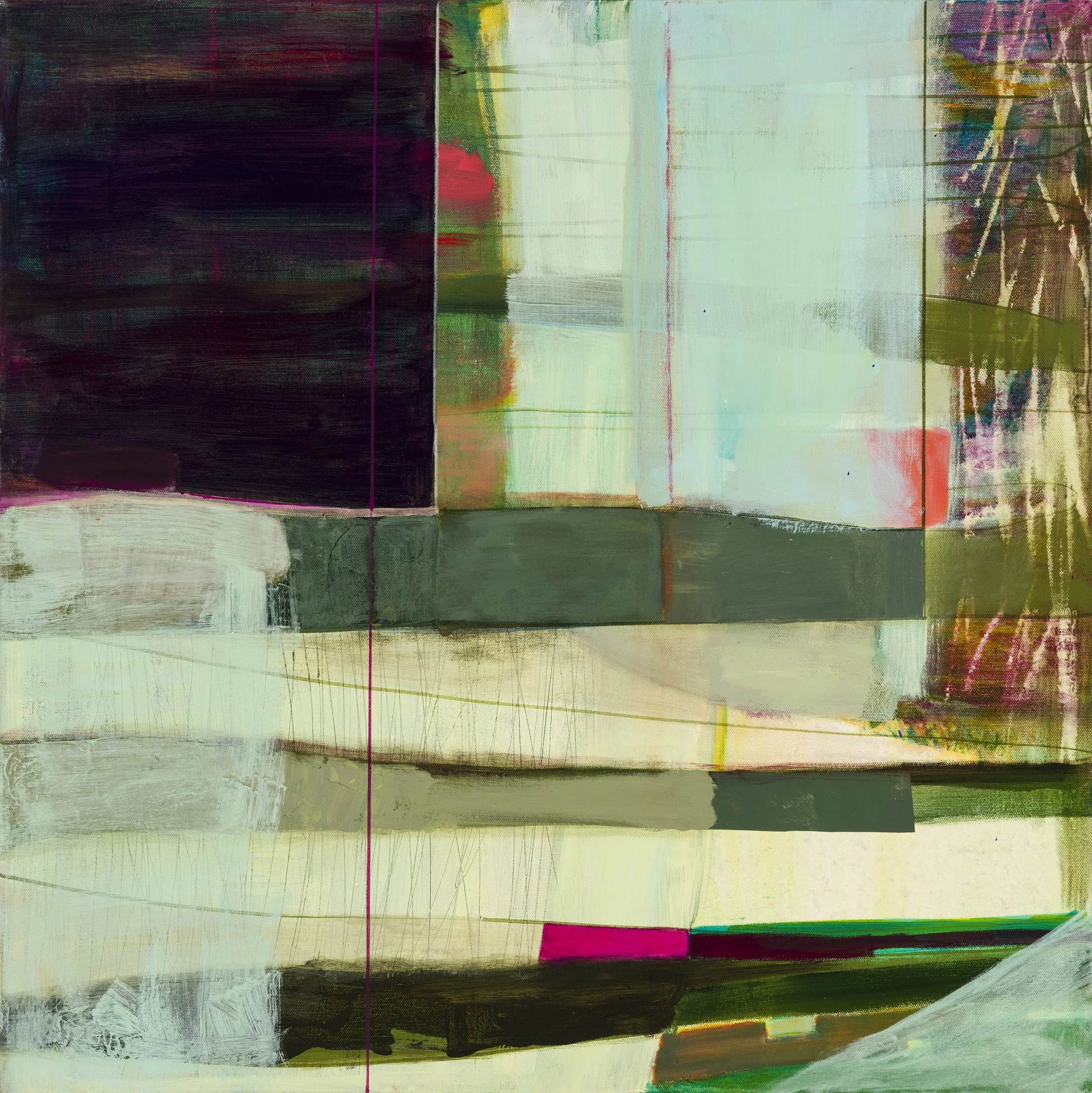 Ellen Goldschmidt - Pardon My Paradoxes Embracing its ironic title, Ellen Goldschmidt's new exhibition, Pardon My Paradoxes beckons viewers into a colorful world of contradictions. Among the exhibition's paradoxes are pictures that invite multiple reads. In one painting, for example, suggestions of an underground root system may equally be read as a towering highway. In another, granite-toned rock formations vie with fleshcolored strata that suggest viscera, producing a paradoxical conflation of the outer and inner. This push and pull of overlapping interpretations is heightened by the artist's seductive use of color, which provides a gateway into her complex, richly-layered abstractions.
